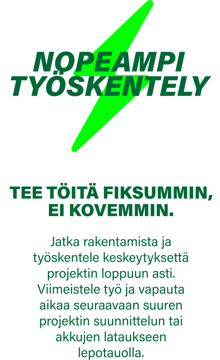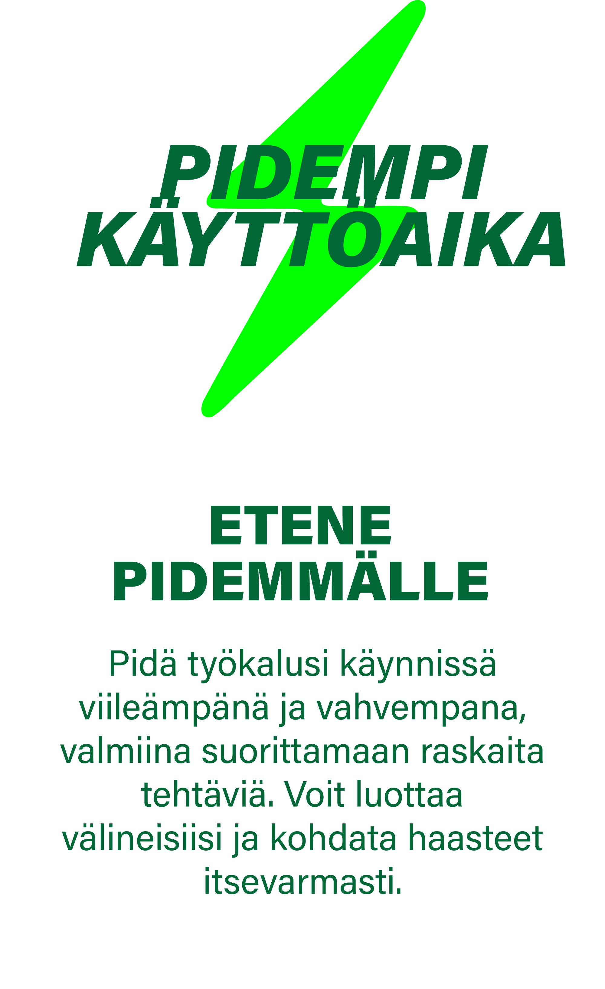 Akku muuttaa automaattisesti jännitetasoa käytettävän koneen mukaan. Nyt voit työskennellä samalla teholla kuin johdollisilla koneilla, mutta saat täydellisen liikkumavapauden ja turvallisuuden ilman häiritseviä johtoja.
